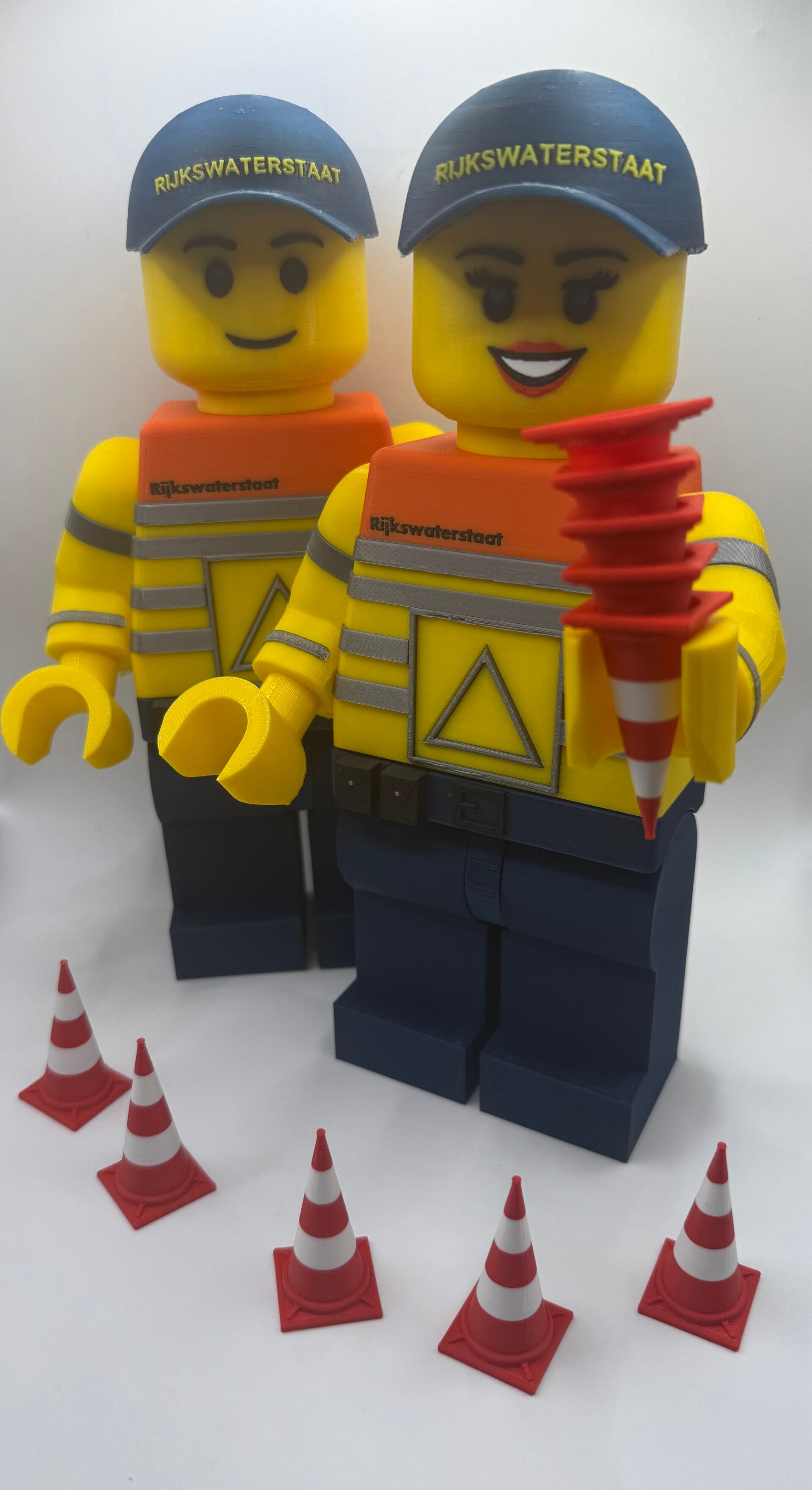 De unieke Rijkswaterstaat pop (kan geleverd worden als man of als vrouw) geheel overeenkomstig met het landelijke uniform van Rijkswaterstaat en de Provincie, de pop hoogte is 26 centimeter. Ook kan je 5 of 10 mooie kegels(pilonnen) bij bestellen!
